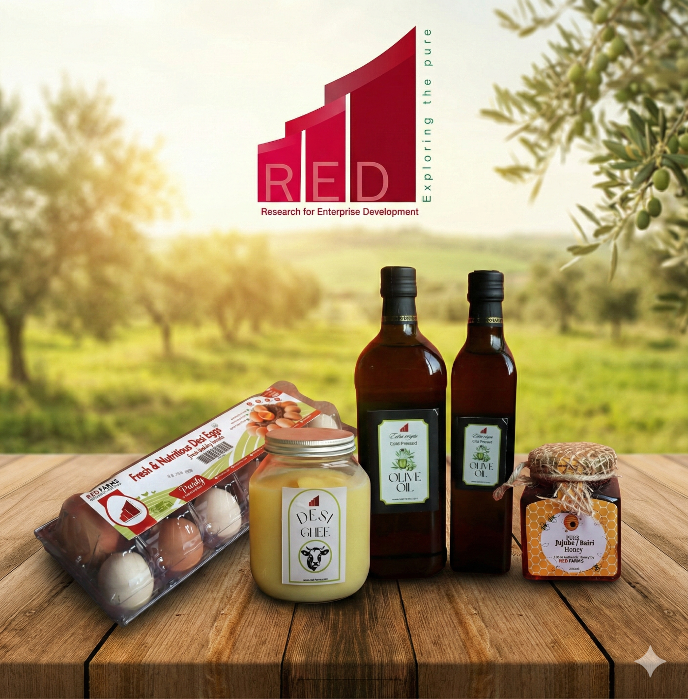 RED Farms produces and supplies premium organic food in Pakistan, specializing in Desi Chicken and nutrient-rich Desi Eggs. We also offer authentic Desi Ghee, 100% pure Jujube (Bairi) Honey, and Cold-Pressed Olive Oil, delivering farm-fresh purity directly to your table.